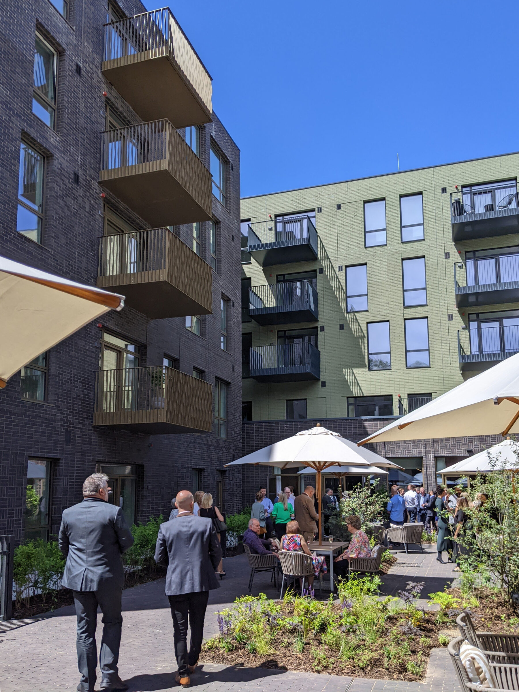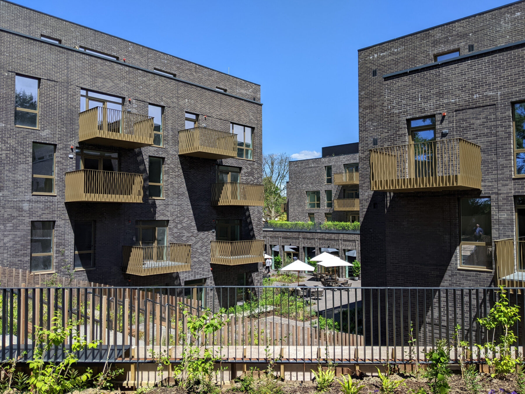 The pavilions use either a green brick or a black brick, inspired by the colours of the trees against the sky, to distinguish between elements, and a variety of brick bond patterns to enliven the facades. The scheme is currently on site and is due for completion in early 2024.