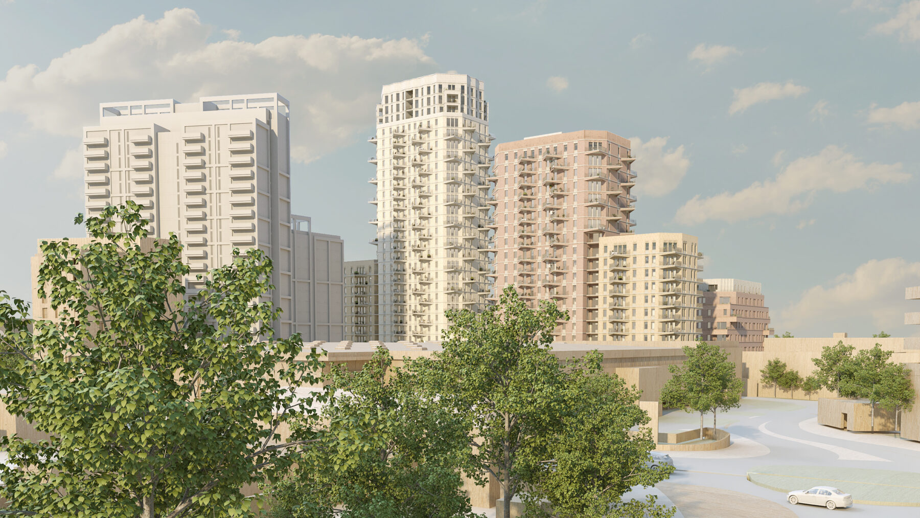 The proposal is for a mixed use residential garden podium scheme compromising of 5 towers between 10 – 24 storeys. The scheme retains the existing Access Self Storage use while creating 655 new homes, alongside new office, commercial and residential amenity uses.