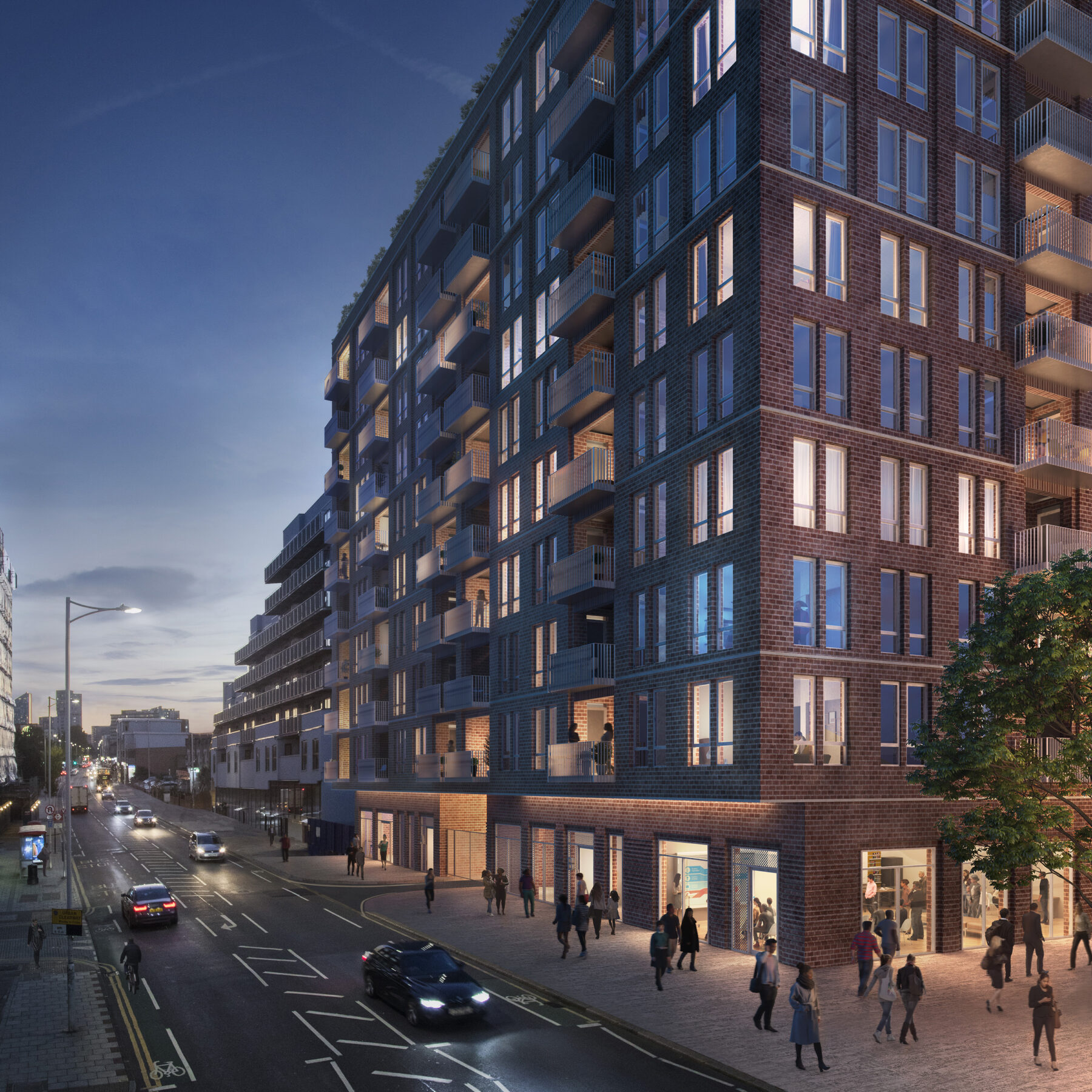 The proposal includes 64 affordable rented dwellings, 86% of which are 2 and 3 bedroom family homes, as well as 80 shared ownership dwellings. All dwellings will benefit from substantial, high-quality communal amenity space situated on the roof of the building, as well as their own dedicated private amenity space. Also featured are new flexible commercial units on the ground floor, providing activity to the street, a sense of vibrancy and creating local job opportunities.